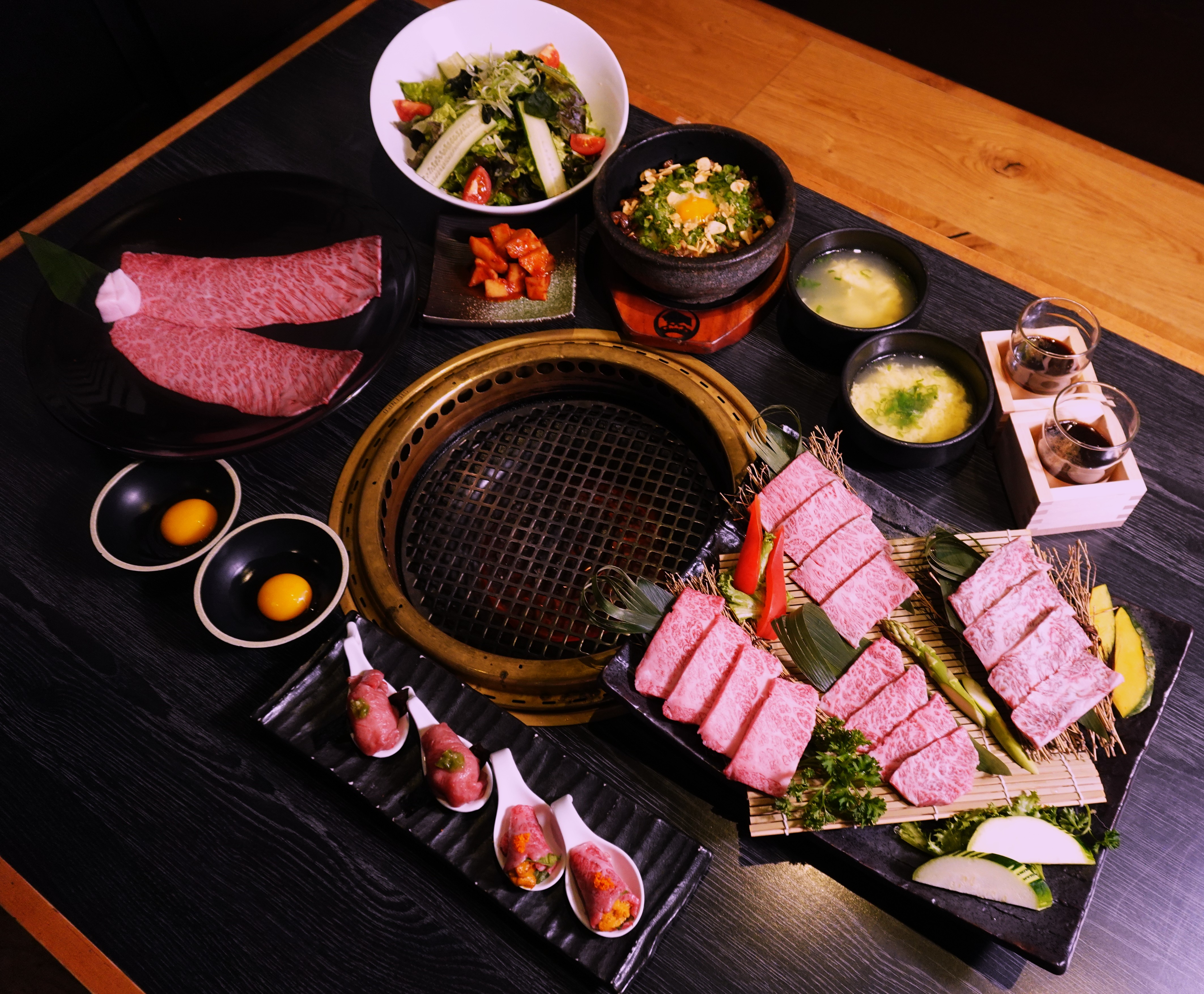 メインには、カイノミ、イチボ、ザブトン、内ハラミの選りすぐりのA5和牛を本格的な日本式焼肉スタイルでご提供。特製キムチ、A5石焼き旨味ライス、玉子スープとともにお楽しみいただけます。締めくくりには、バニラ・抹茶・ライチの中からお選びいただけるアイスクリームをご用意しています。