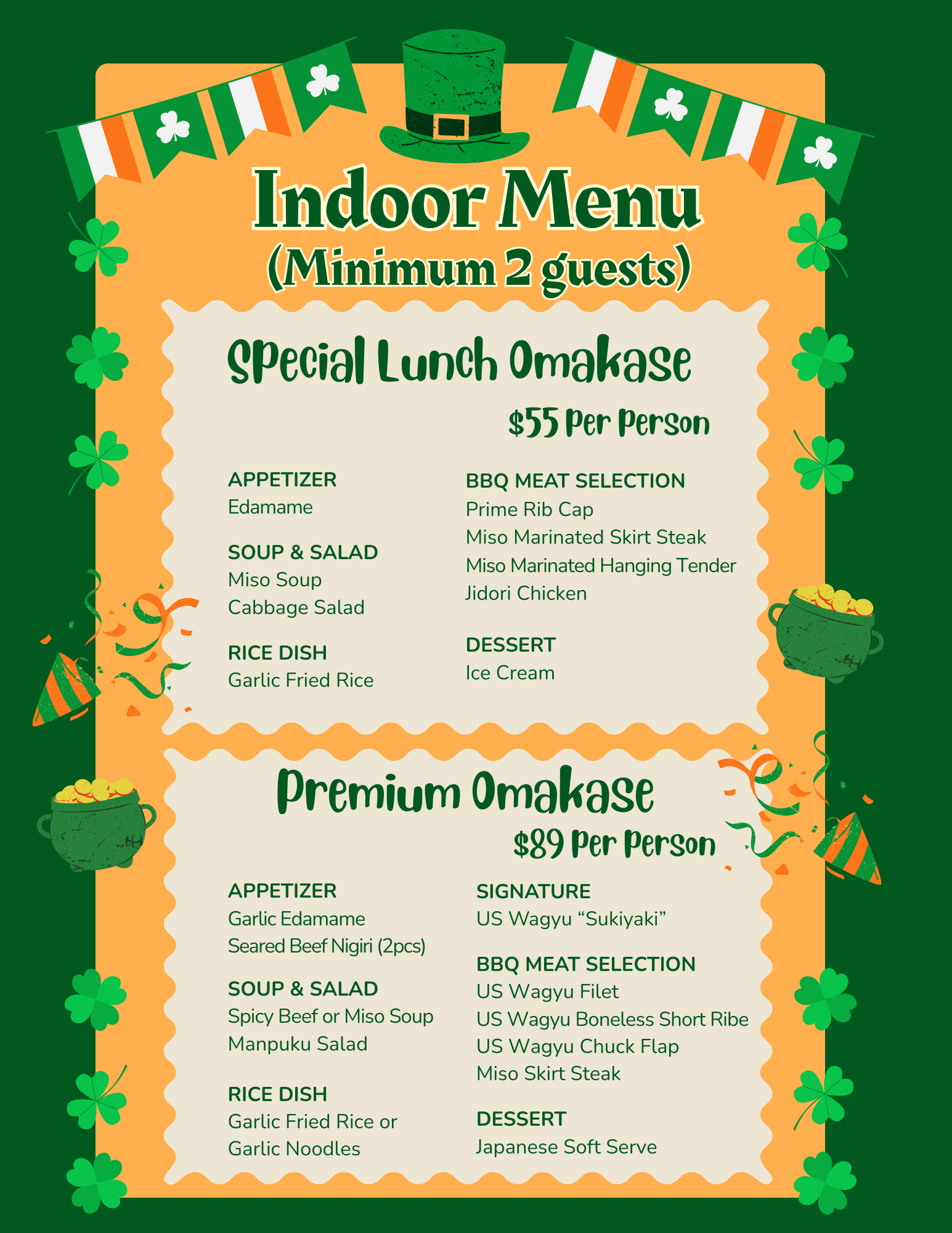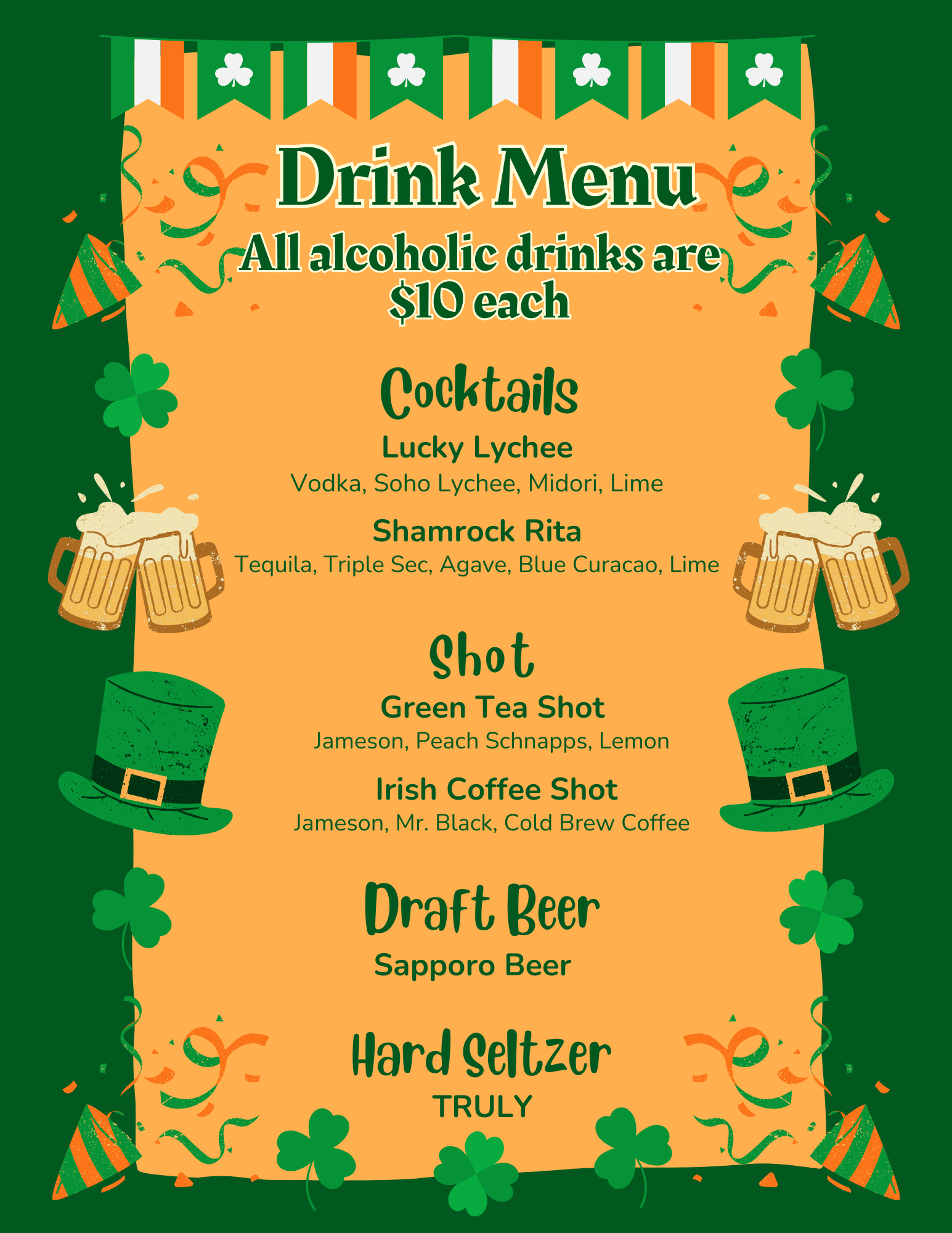 If you’re stopping by for drinks, snacks, or coming solo, our patio will be open and ready for you. All St. Patrick’s Parade special alcoholic drinks are $10, and we’ll have a special snack menu available. Please check the menu below!